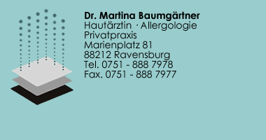 Dr. med. Martina Baumgärtner ist Ihre erfahrene Hautärztin und Allergologin in Ravensburg, Baden-Württemberg. Am Marienplatz 81, 88212 Ravensburg, bietet Ihnen Frau Dr. Baumgärtner umfassende dermatologische Versorgung auf höchstem Niveau. Als Spezialistin für Dermatologie liegt ein besonderer Schwerpunkt auf der Hautkrebsvorsorge. Profitieren Sie von ihrer Expertise und langjährigen Erfahrung in allen Bereichen der Hautheilkunde. Die Praxis von Dr. med. Martina Baumgärtner steht auch Privatpatienten offen. Vereinbaren Sie jetzt Ihren Termin und kümmern Sie sich um Ihre Hautgesundheit in Ravensburg.
